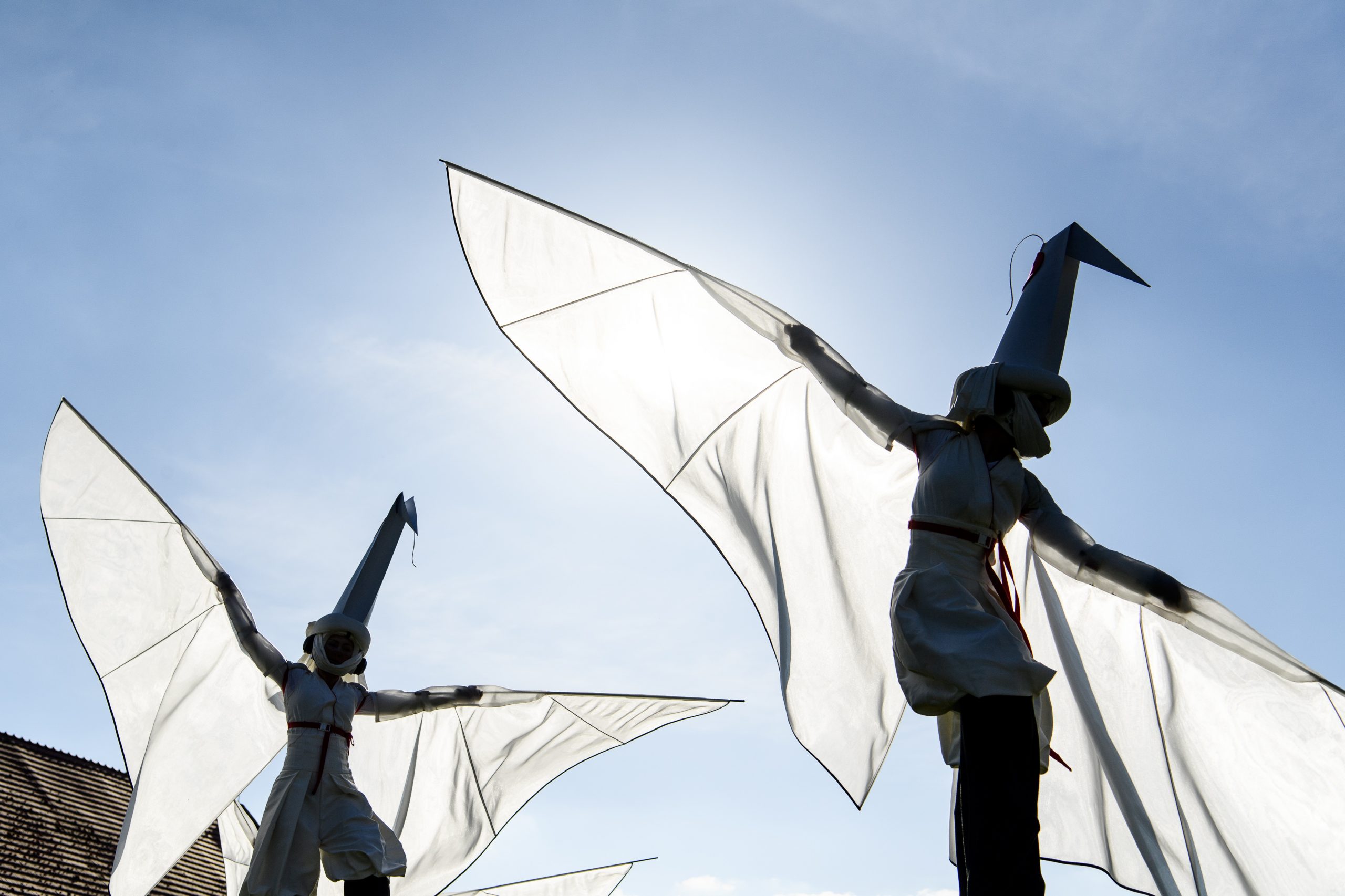 Bewegung ist alles. SCHWARM von Grotest Maru bewegt das Publikum über Stationen der Migration von Kranichen. Die Flugrouten der Zugvögel kreuzen sich mit Migrationsrouten von Menschen. Übergroße Kranichfiguren – Performer*innen auf Stelzen mit mehreren Metern Flügelspannweite – ziehen durch Städte und Landschaften. Live produzierter und über Kopfhörer empfangener Sound kreiert intime akustische Welten. Livevideoprojektionen erweitern den visuellen Wahrnehmungsraum. SCHWARM ist eine multidisziplinäre Outdoorperformance zu einem der drängendsten Themen unserer Zeit. Poetische Stimmungen vereinen sich mit politischen Fragestellungen. Ein Spektakel für Herz, Kopf und Augen, für Jung und Alt, für Reisende und Sesshafte von dem auf site specific-Projekte spezialisierten internationalen Ensemble der Berliner Compagnie Grotest Maru.