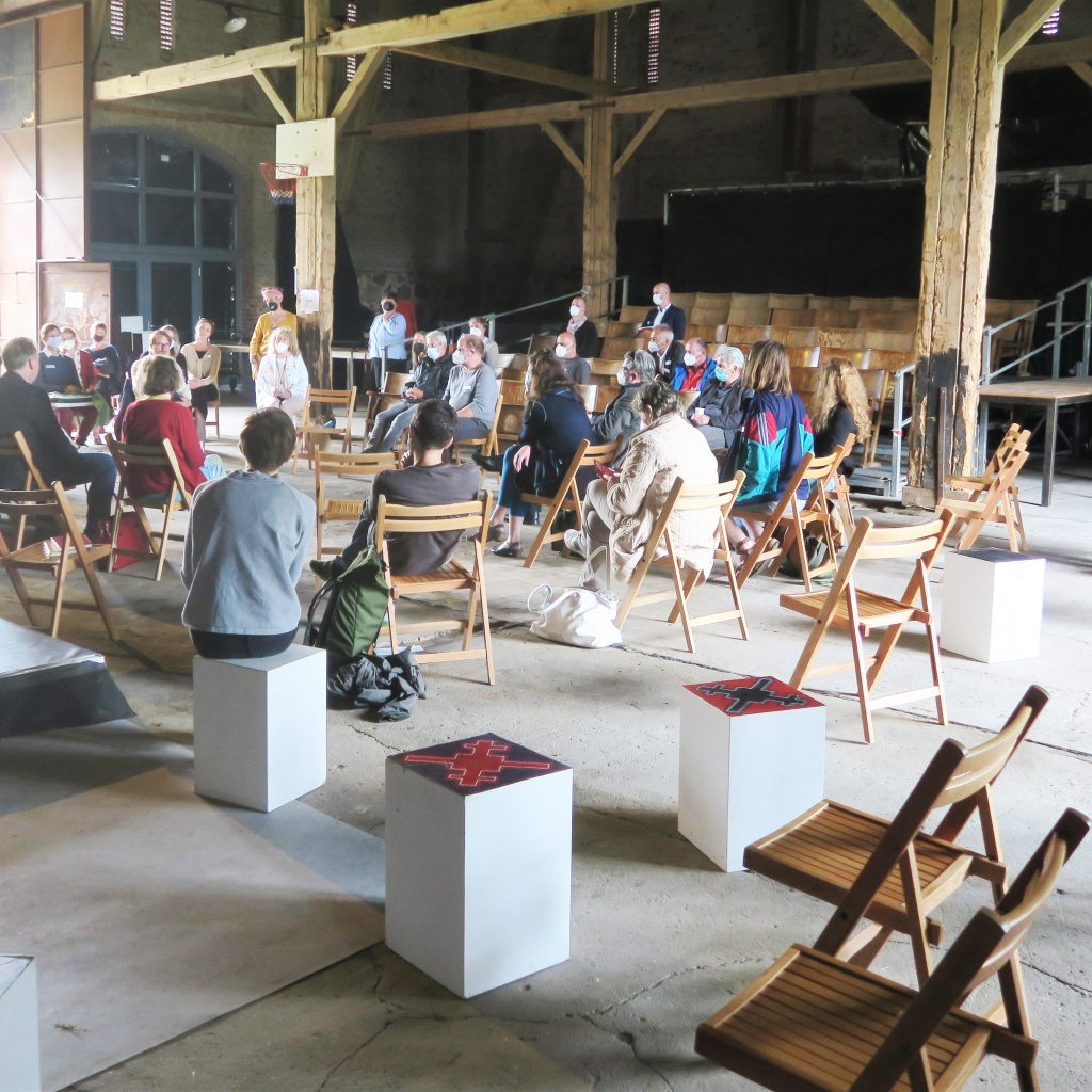 Flaches Giebeldach, 8 Ständerbalken, Breite 21,50 m, Tiefe 36,20 m, Höhe Giebel 10 m, Höhe Sparren Mitte 7,94 m, Außen 4,25 m. Hängemöglichkeiten für Tuch/Trapez, Steinboden, Traversen für Licht und Ton, nicht beheizbar, verdunkelt